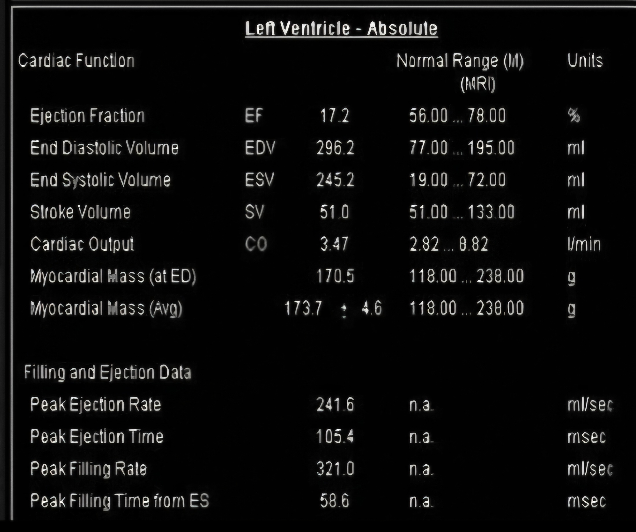Und dass man mit meinen Messergebnissen durchaus eine DCM haben kann, hat mir meine Internetrecherche bestätigt. Hierzu findet ihr im Anhang die Messergebnisse eines DCM Patienten aus einem anderen Forum. Die Ergebnisse sind fast identisch mit meinen, wobei mein LVEDV hier sogar größer ist. Kennt sich denn niemand mit MRT Ergebnissen aus und kann was dazu sagen?